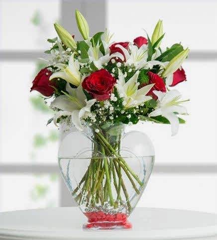 Kalp Cam içerisinde Kırmızı Güller ve Beyaz Lilyumlar - 3.000,00 TL
