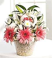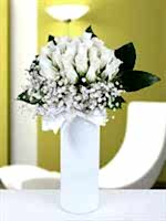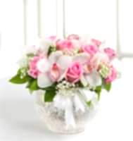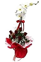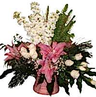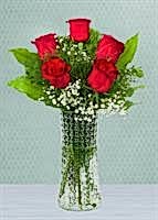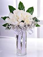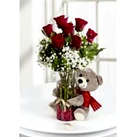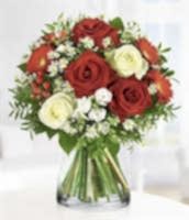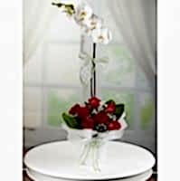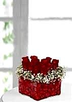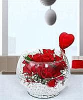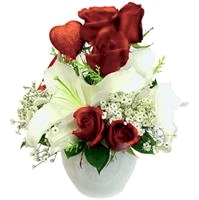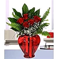Kalp Cam içerisinde Kırmızı Güller ve Beyaz Lilyumlar