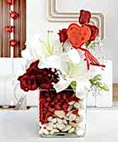 Kalp Cam içerisinde Kırmızı Güller ve Beyaz Lilyumlar